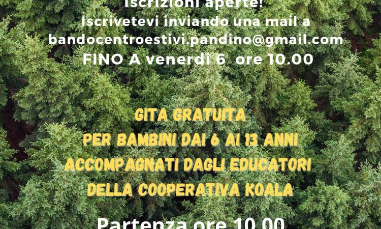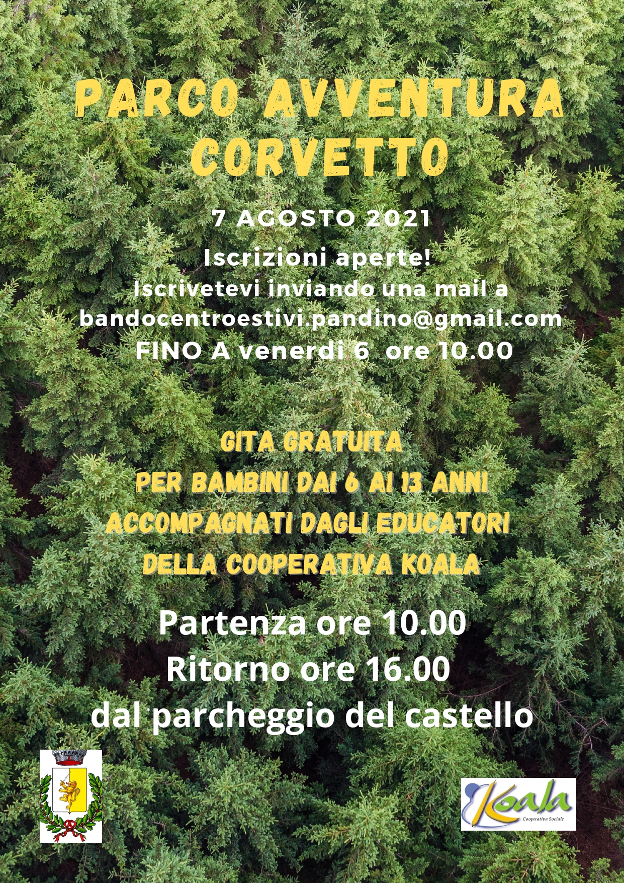 PER LA GITA AL PARCO AVVENTURA CORVETTO, APERTA ANCHE AI NON FREQUENTANTI IL CENTRO ESTIVO COMUNALE E PROGRAMMATA PER SABATO 7 AGOSTO (DALLE 10:00 ALLE 16:00 - FASCIA D'ETÀ: 6-13 ANNI), È NECESSARIO PRENOTARE INVIANDO UNA MAIL ENTRO LE ORE 10;00 DI VENERDÌ 6 AGOSTO AL SEGUENTE INDIRIZZO: bandocentriestivi.pandino@