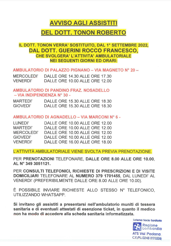 AVVISO AGLI ASSISTITI DEL DOTT. TONON ROBERTO