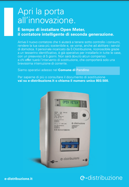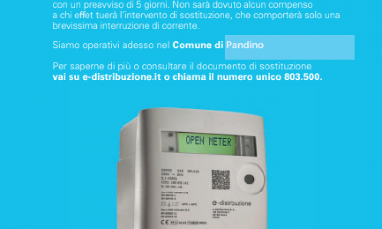 Si comunica che dal mese di luglio al mese di ottobre 2022 E-distribuzione provvederà a sostituire molti contatori dell'energia elettrica in molte abitazioni del Comune di Pandino.