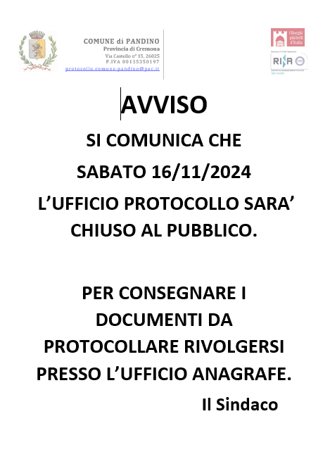 AVVISO RELATIVO A UFFICIO PROTOCOLLO PER LA GIORNATA DEL 16.11.2024