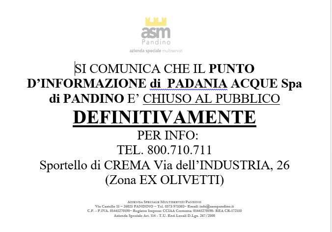 CHIUSURA DEFINITIVA PUNTO D'INFORMAZIONE DI PADANIA ACQUE DI PANDINO