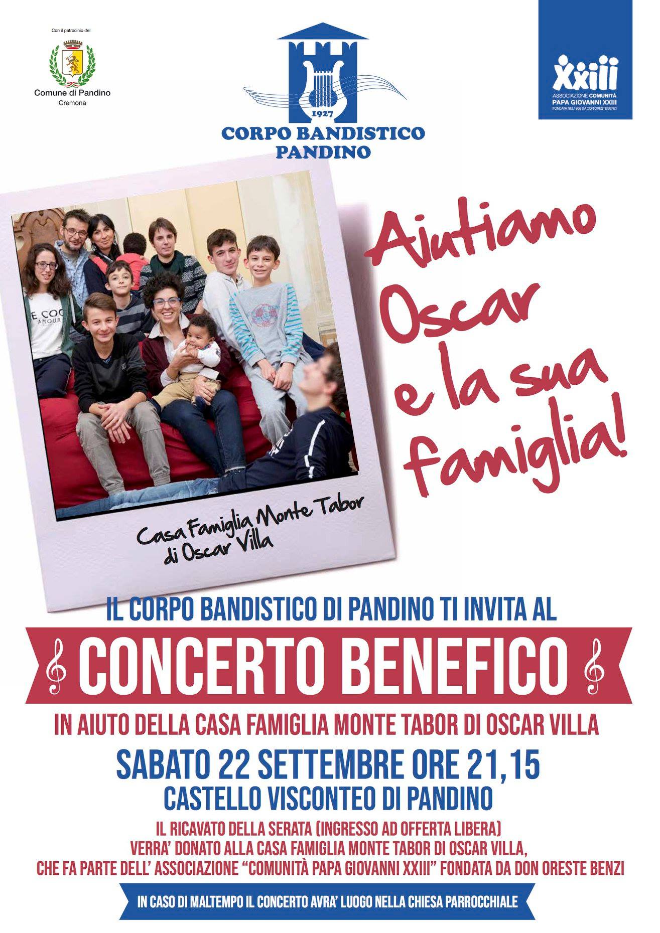 Il Corpo Bandistico di Pandino organizza per Sabato 22 Settembre, alle 21.15, nell'arena interna del Castello Visconteo di Pandino, un concerto di Beneficenza a favore della Casa Famiglia del concittadino Oscar Villa e di sua moglie Daniela.