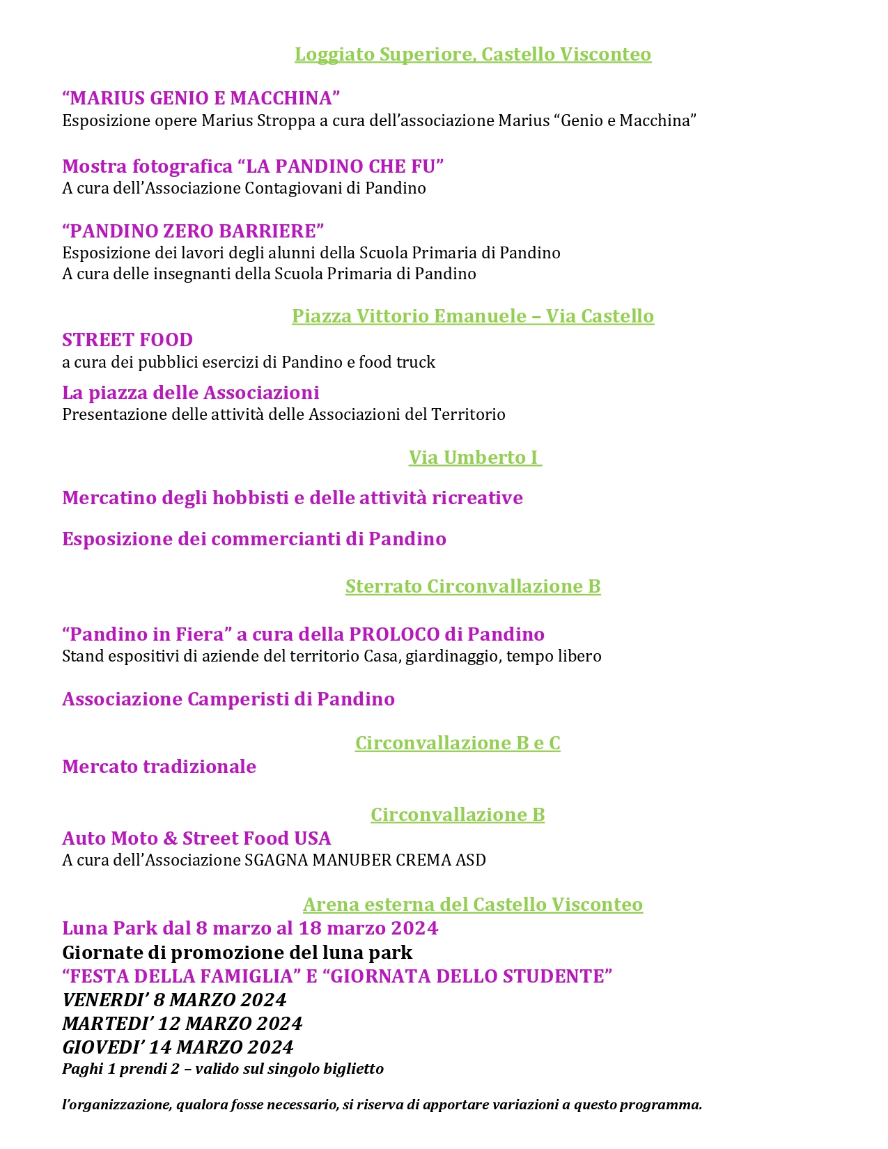 La manifestazione prevede bancarelle, mercatini dei creativi, esposizione delle aziende del territorio e degli autoveicoli, prodotti tipici, eventi, mostre di pittura, luna park, street food, spettacoli itineranti, giochi in strada, giochi di una volta.