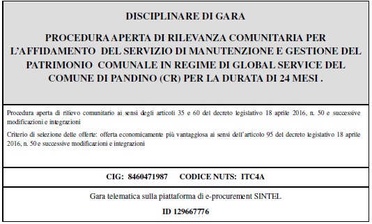 PATRIMONIO COMUNALE IN REGIME DI GLOBAL SERVICE DEL COMUNE DI PANDINO (CR) PER LA DURATA DI 24 MESI .