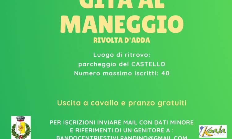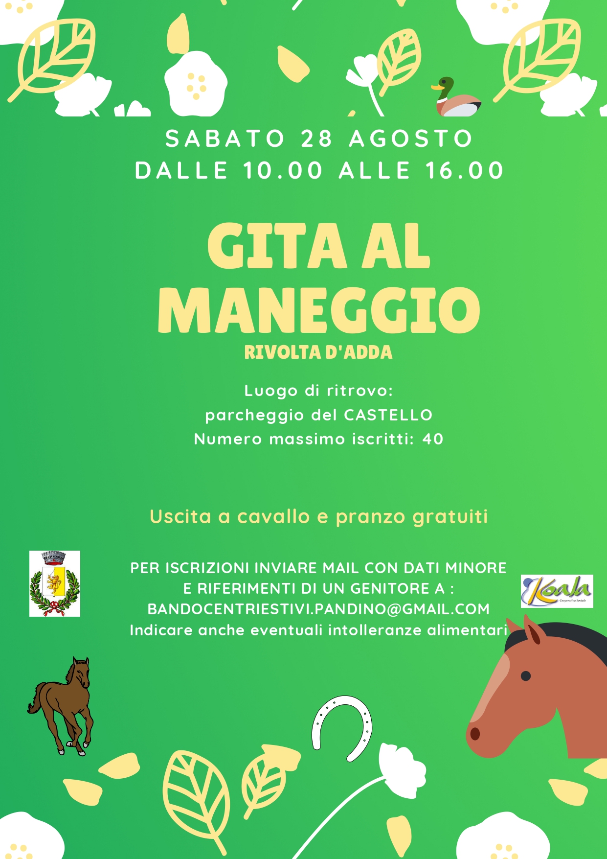 SI COMUNICA CHE SONO APERTE LE ISCRIZIONI PER LA GIORNATA AL "CENTRO IPPICO DI RIVOLTA D'ADDA" PREVISTA PER IL GIORNO SABATO 28 AGOSTO CON IL PROGETTO "NATURALMENTE ESTATE" CHIUSURA ISCRIZIONI MERCOLEDI' 25 AGOSTO, CON UN LIMITE MASSIMO DI 40 POSTI.