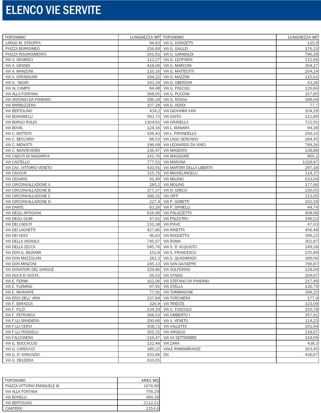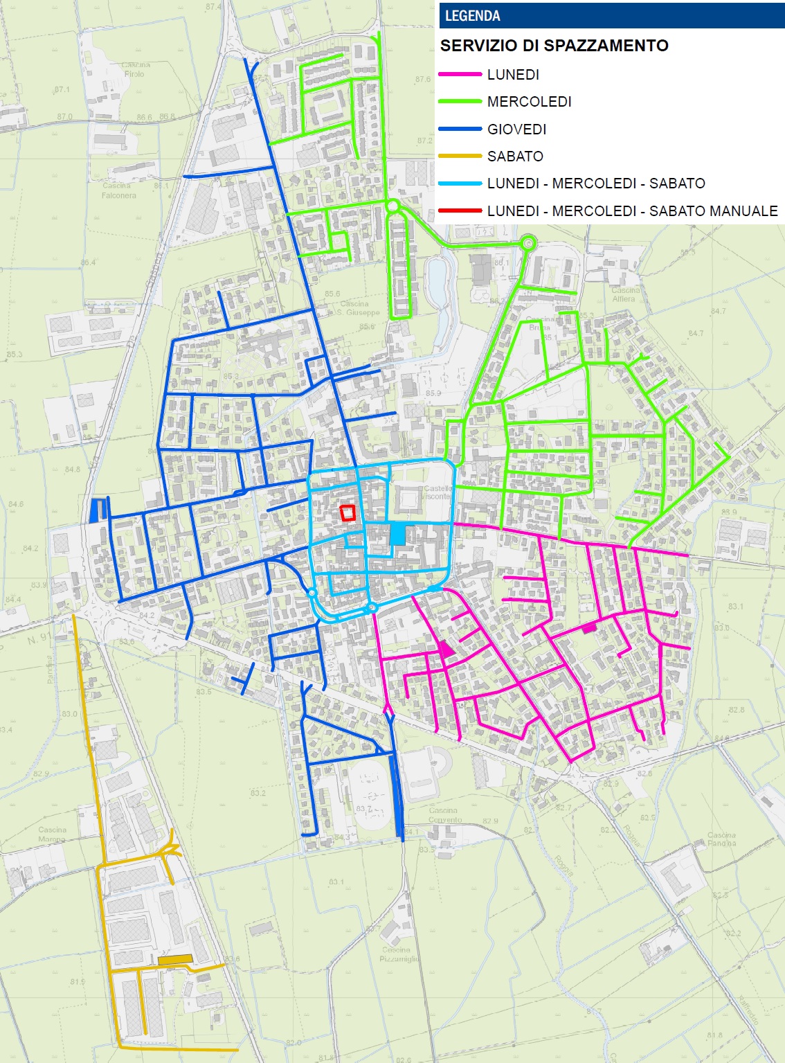 Negli elaborati pubblicati di seguito è possibile prendere visione della suddivisione del terriotorio comunale con riferimento al servizio di spazzamento strade effettuato da Linea Gestioni srl.