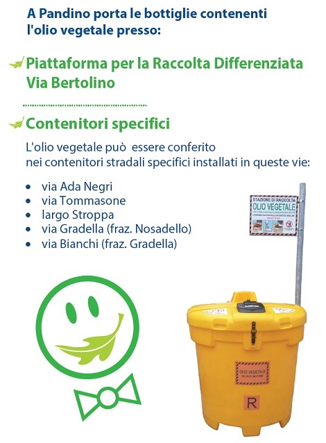 8 Giugno 2021 Tipo articolo: Notizia Indicazioni per il corretto conferimento degli olii vegetali presso i centri di raccolta dislocati sul territorio. AllegatoDimensione pandino_olio_vegetale.pdf2.16 MB immagine_copertina_0.jpg83.19 KB Area tematica: Ambiente ed ecologia