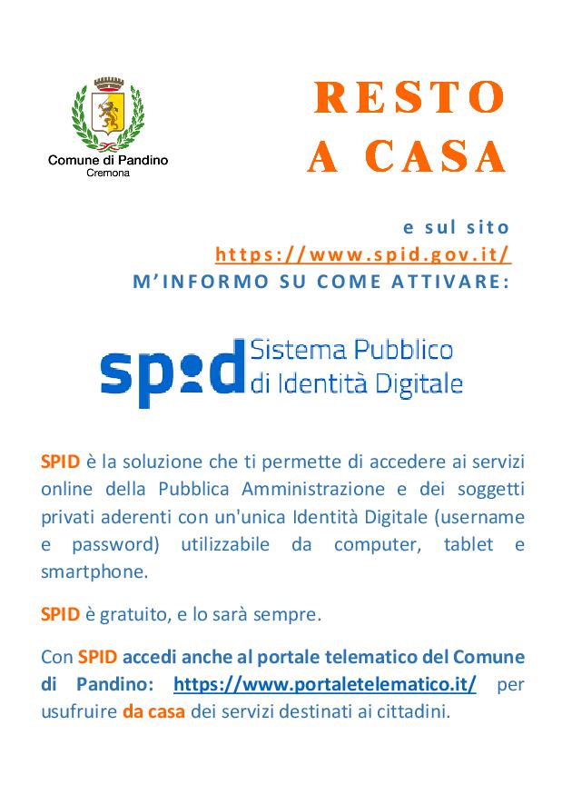 24 Marzo 2020 Tipo articolo: Notizia PER RICHIEDERE SPID ED AVERE INFORMAZIONI PER ACCEDERE AL PORTALE TELEMATICO DEL COMUNE DI PANDINO