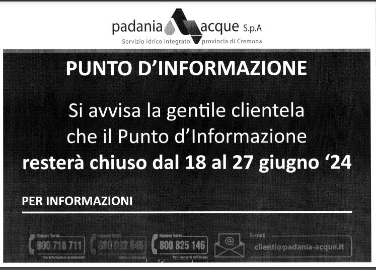 SPORTELLO PADANIA ACQUE - CHIUSURA DAL 18 AL 27 GIUGNO 2024