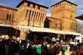 La Piazza Vittorio Emanuele III e la Via Castello, dove si svolge il mercato sono esattamente in fronte al Castello Visconteo e racchiudono gli elementi architettonici più importanti di Pandino quali: