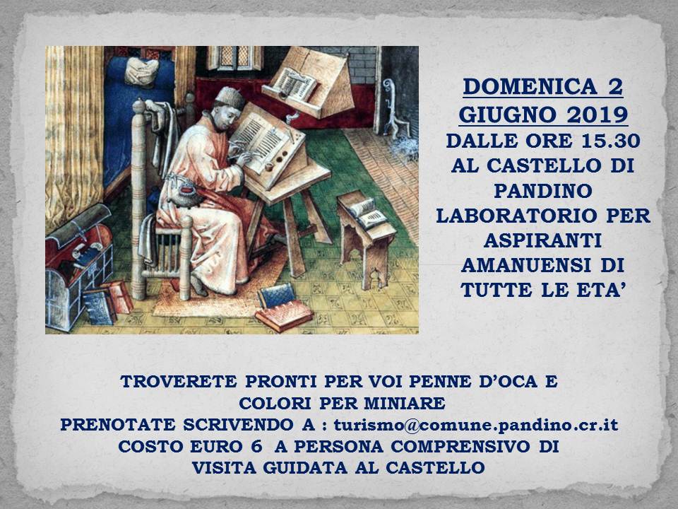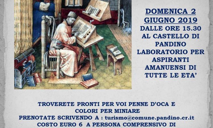 Dopo aver sperimentato per alcuni mesi l'attività didattica "Il Piccolo Scriptorium" riservandola ai ragazzi dai 6 ai 12 anni, visti l'interesse e le richieste arrivate, l'Ufficio Turistico di Pandino ha deciso di riproporre la medesima attività anche per domenica 2 giugno 2019, dando questa volta però la possibilità a tutti, grandi e piccoli , di partecipare. Per chi volesse dunque calarsi nei panni di un copista del medioevo, basta prenotare alla nostra mail turismo@comune.pandino.cr.it e il 2 giugno prossimo, a partire dalle ore 15.30, avrà a propria disposizione penne d'oca, pennelli, foglia d'oro, tempere per realizzare la propria pagina di codice miniato.