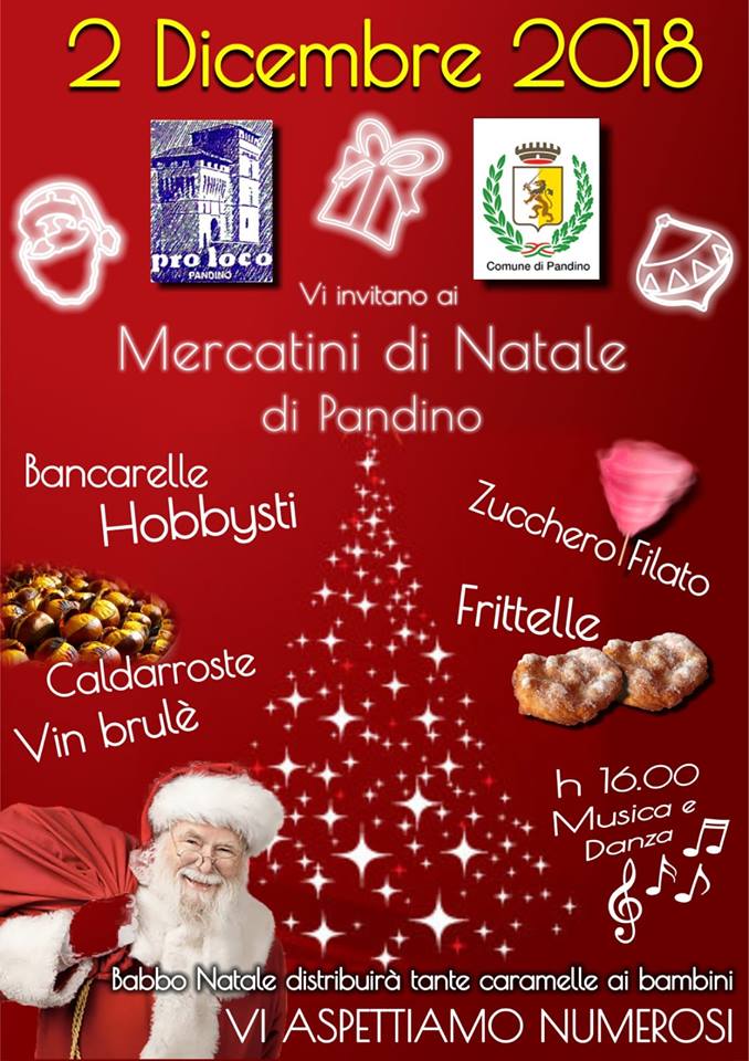 Vi invitiamo ai Mercatini di Natale di Pandino che si terranno il giorno 2 Dicembre 2018. Saranno presenti le bancarelle degli hobbysti, tante fritelle, caldarroste e non potrà mancare il Vin Brulè. Dalle ore 16,00 tanta musica e divertimento per tutti.