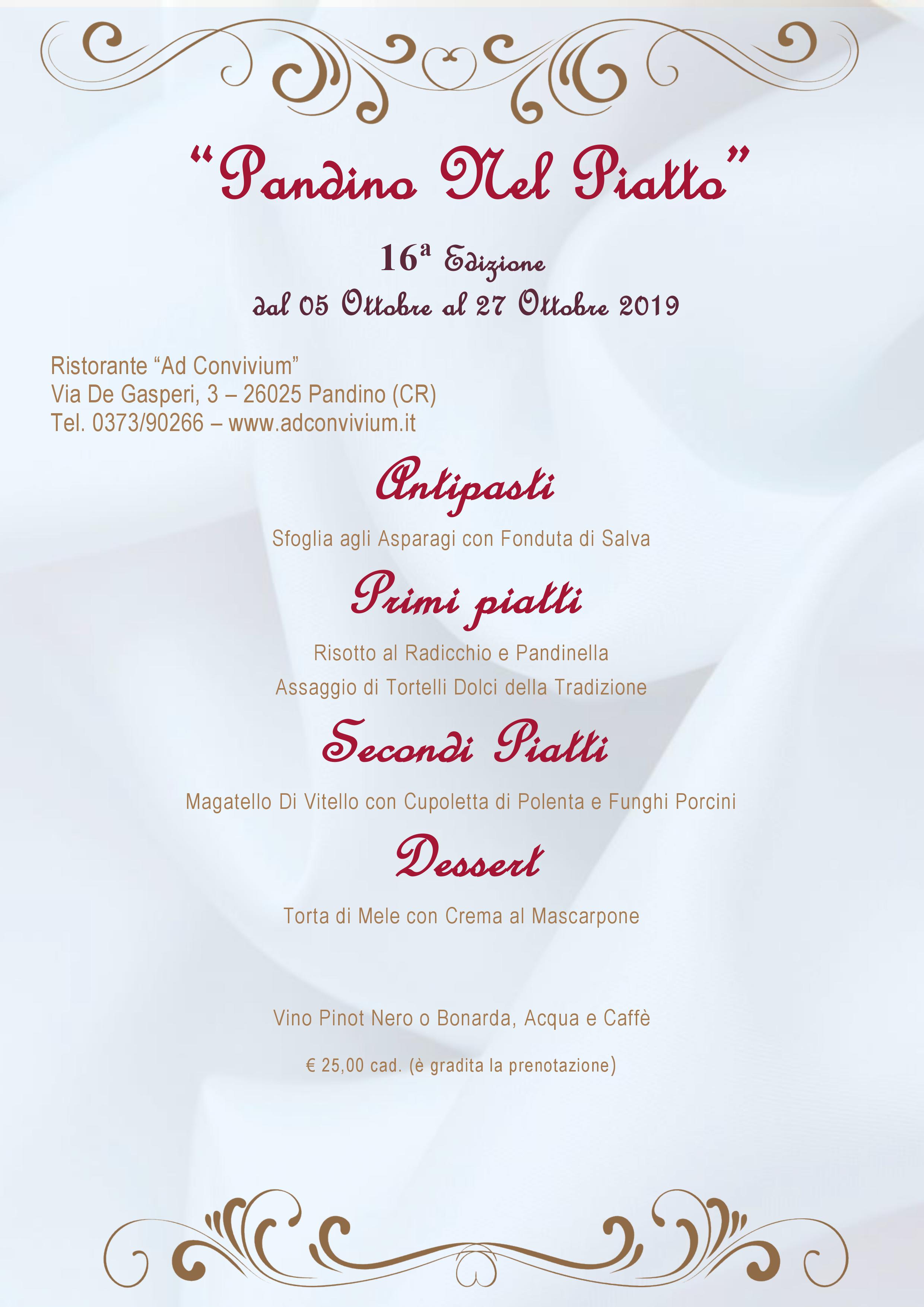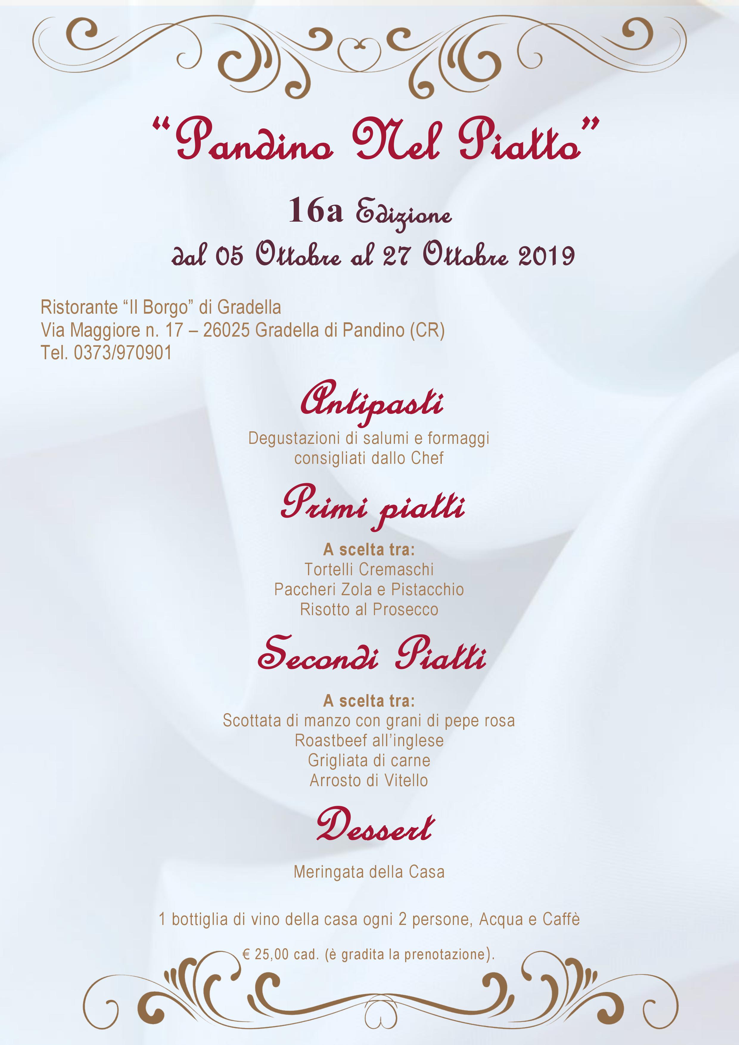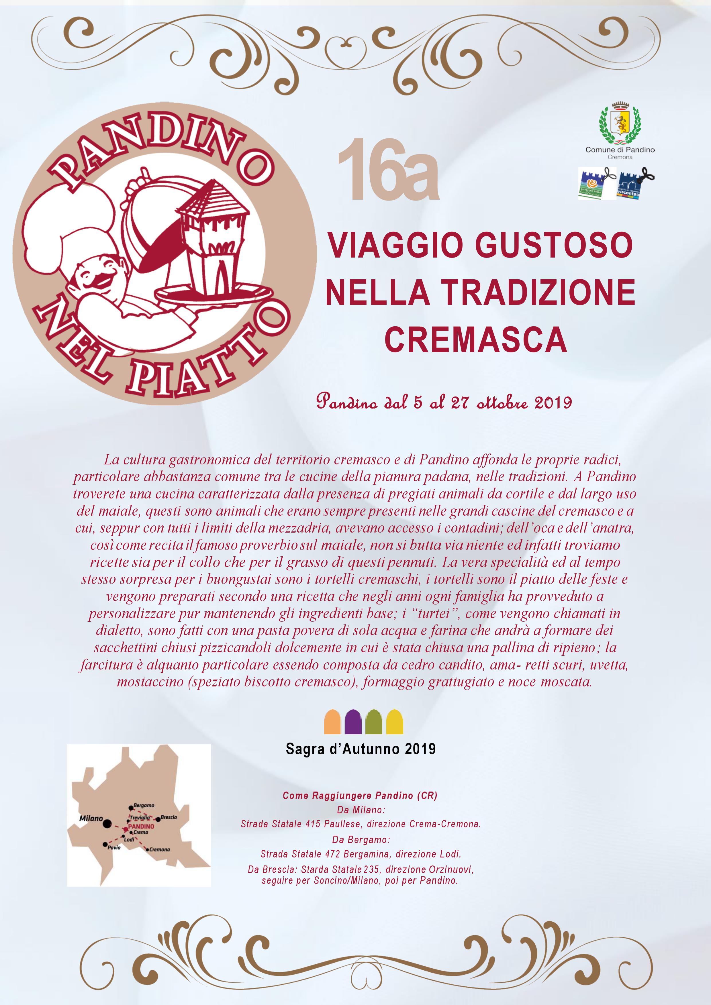 La cultura gastronomica del territorio cremasco e di Pandino affonda le proprie radici, particolare abbastanza comune tra le cucine della pianura padana, nelle tradizioni. A Pandino troverete una cucina caratterizzata dalla presenza di pregiati animali da cortile e dal largo uso del maiale, questi sono animali che erano sempre presenti nelle grandi cascine del cremasco e a cui, seppur con tutti i limiti della mezzadria, avevano accesso i contadini; dell’oca e dell’anatra, così come recita il famoso proverbio sul maiale, non si butta via niente ed infatti troviamo ricette sia per il collo che per il grasso di questi pennuti. La vera specialità ed al tempo stesso sorpresa per i buongustai sono i tortelli cremaschi, i tortelli sono il piatto delle feste e vengono preparati secondo una ricetta che negli anni ogni famiglia ha provveduto a personalizzare pur mantenendo gli ingredienti base; i “turtei”, come vengono chiamati in dialetto, sono fatti con una pasta povera di sola acqua e farina che andrà a formare dei sacchettini chiusi pizzicandoli dolcemente in cui è stata chiusa una pallina di ripieno; la farcitura è alquanto particolare essendo composta da cedro candito, ama- retti scuri, uvetta, mostaccino (speziato biscotto cremasco), formaggio grattugiato e noce moscata.