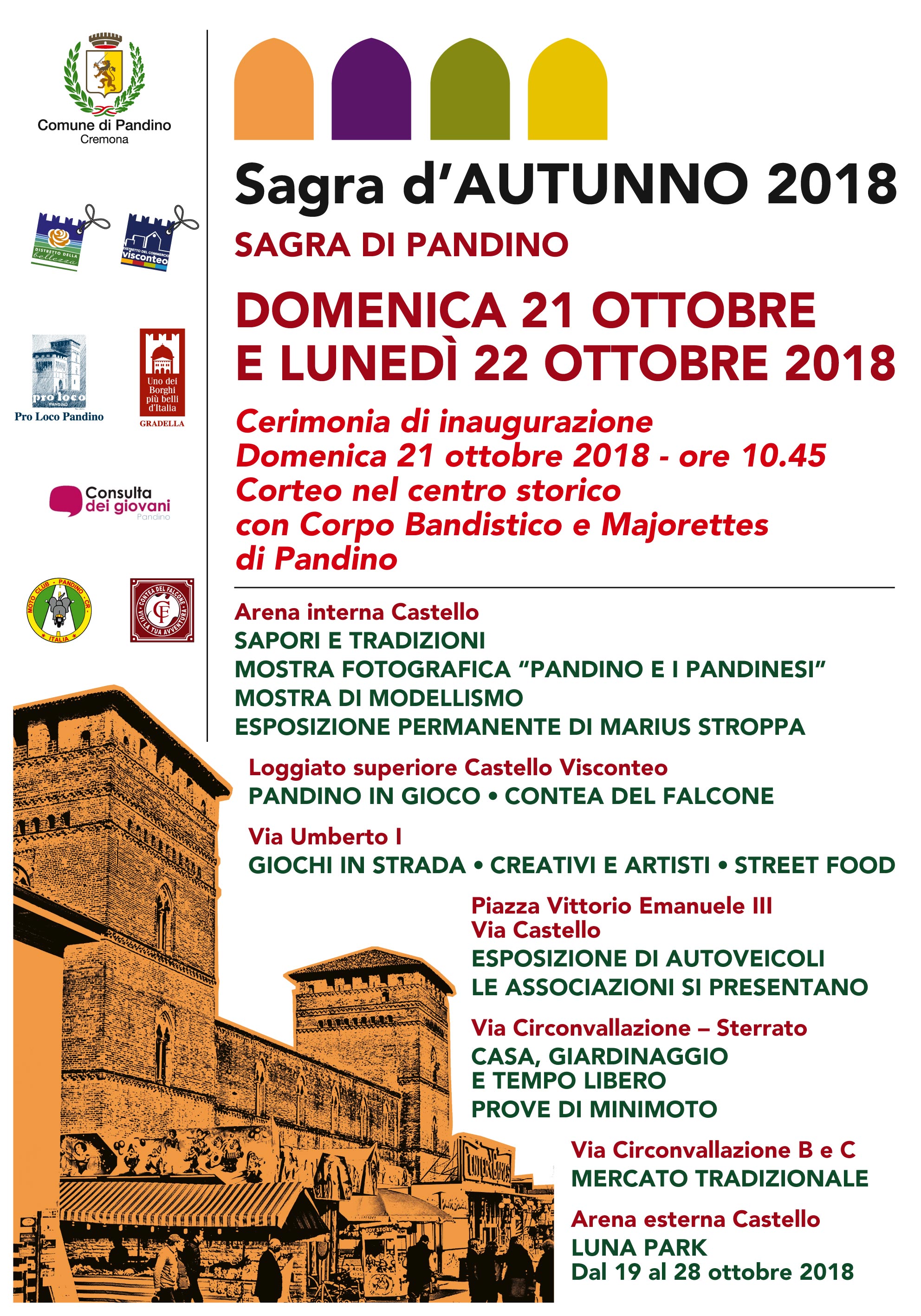 Come da tradizione Pandino si colorerà di sapori e street food, mostre, giochi per bambini e non, il tradizione mercato e non mancherà il classico Luna Park nella bellissima cornice del Castello visconteo.
