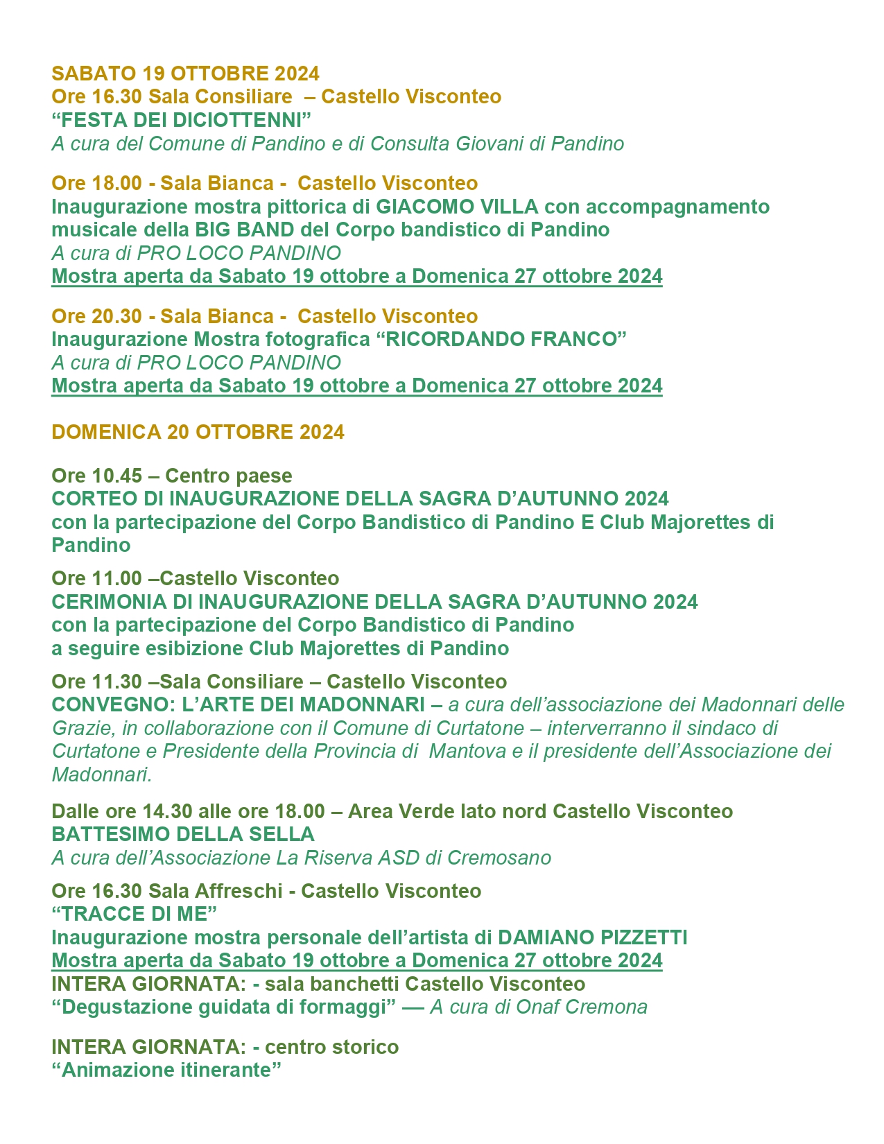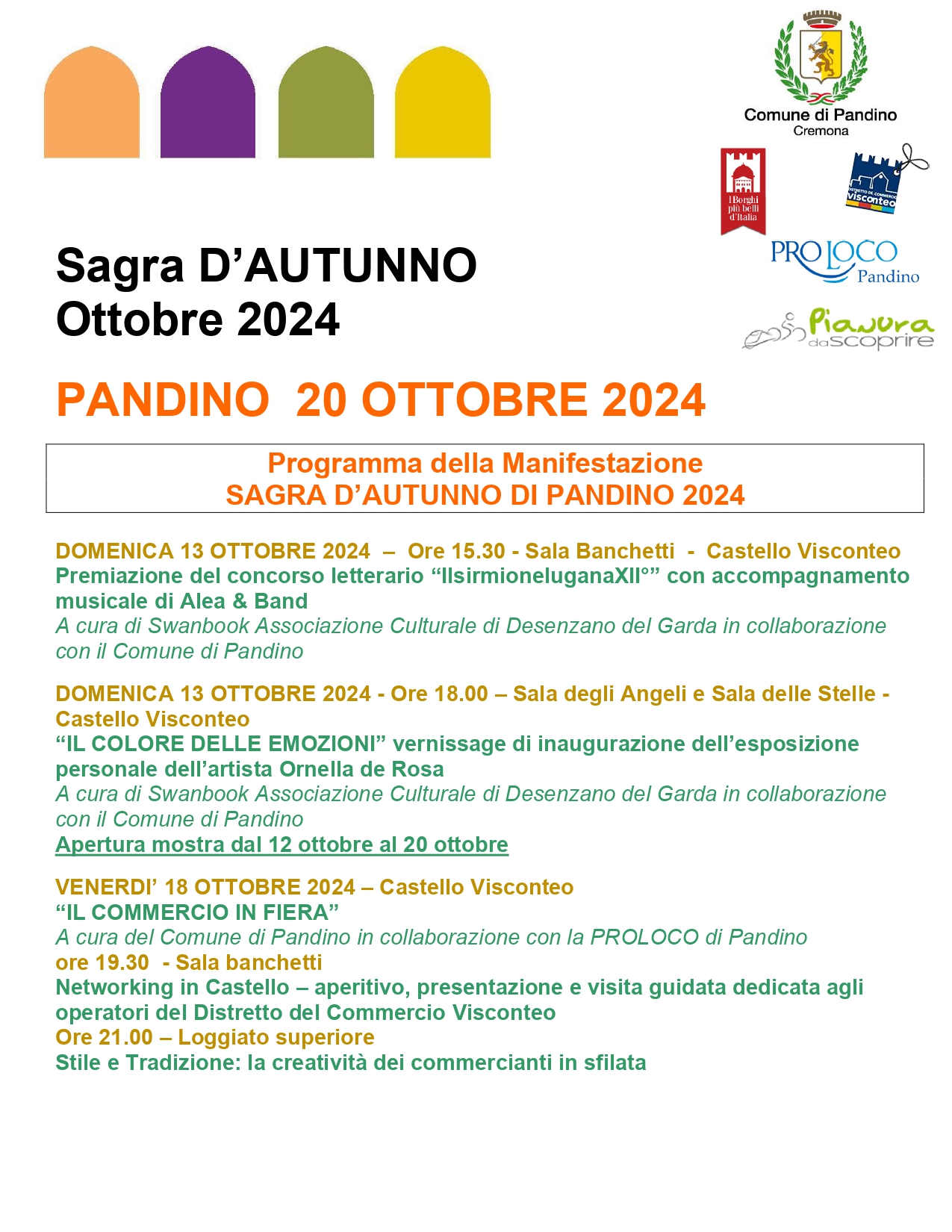 Il programma della manifestazione sarà molto ricco e le iniziative si susseguono durante tutta la settimana precedente alla Sagra, il clima di festa pervade il centro storico e il Castello Visconteo di Pandino.