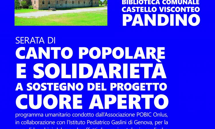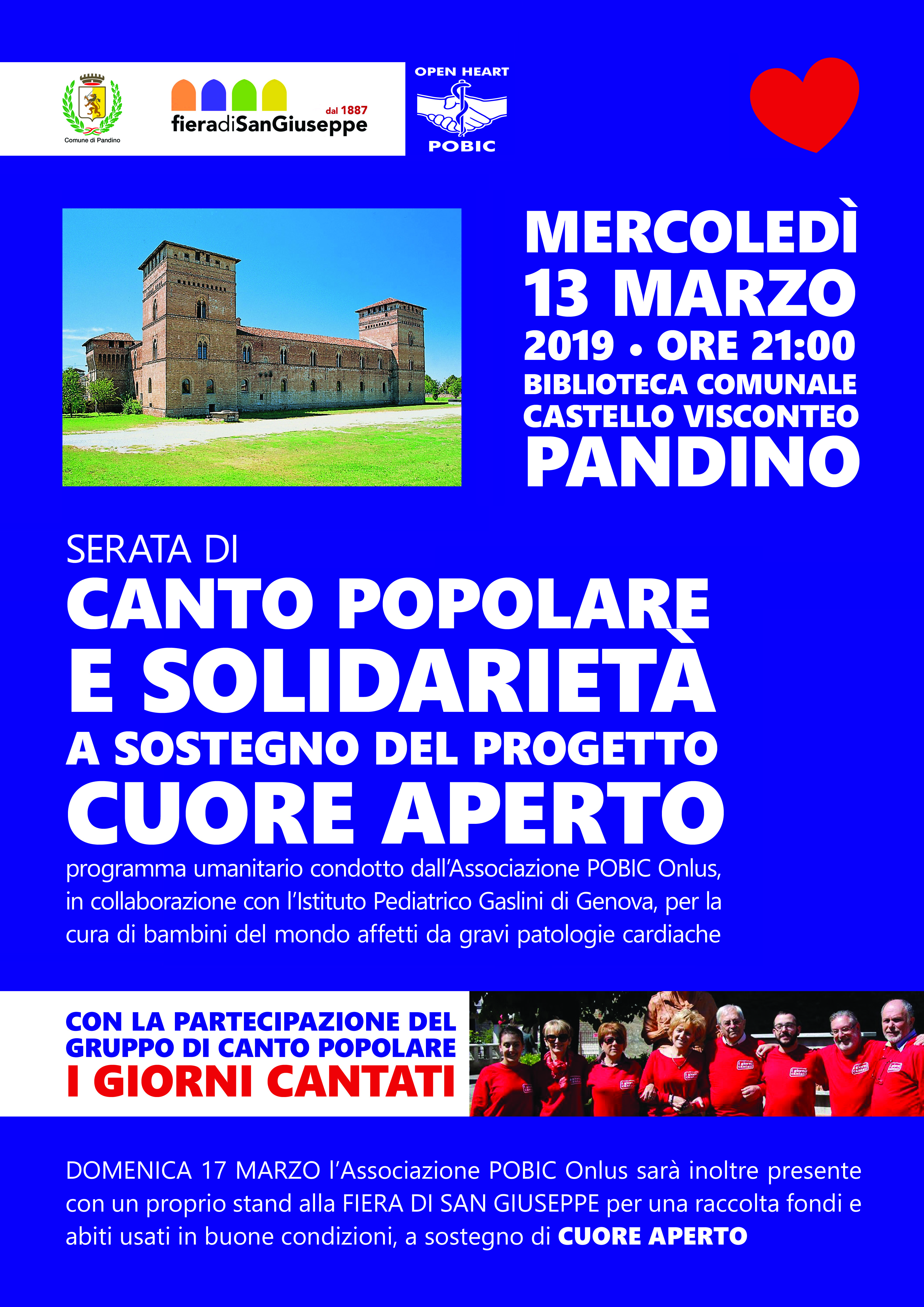 Presso la Bibiloteca del Comune di Pandino il giorno 13 marzo 2019  verrà realizzata la serata di Canto Popolare e Solidarietà a sostegno del progetto Cuore aperto.