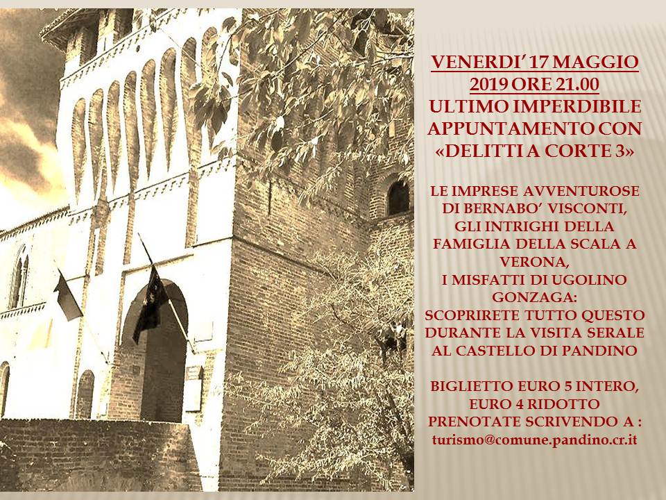 Visto l'ottimo riscontro ottenuto in questi ultimi mesi, anche per maggio l'Ufficio Turistico ripropone, nell'ambito delle visite serali al Castello, l'itinerario "Delitti a Corte 3": ogni stanza del castello attraversata durante il giro fa da cornice a uno o più episodi misteriosi della vita di Bernabò Visconti e dei suoi parenti a Verona, Mantova e altri luoghi, tra agguati, avvelenamenti, assedi e battaglie, misteriose sparizioni e tradimenti. Un modo alternativo per conoscere la storia dei signori del nostro castello, adatto a grandi e piccoli, senza trascurare la descrizione delle caratteristiche che rendono il nostro monumento così affascinante.