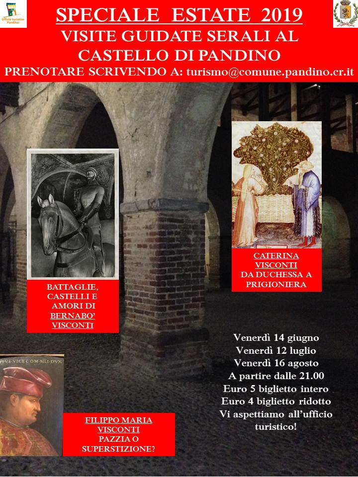 Anche per i mesi estivi l'Ufficio Turistico organizza le visite guidate serali al Castello, iniziativa sempre apprezzata dai visitatori. Nei prossimi mesi, oltre alle peculiarità della storia e delle pitture del nostro castello, torneremo ad approfondire diversi aspetti della vita della famiglia Visconti, in particolare di Bernabò, il signore di Milano che ha voluto costruire qui  a Pandino uno dei suoi Castelli preferiti, personaggio che continua ad intrigare i nostri turisti. Attraverso le vicende della famiglia, cercheremo di far emergere tutta l'importanza storica del ducato di Milano, oggi testimoniata da quello che rimane dei Castelli Viscontei.