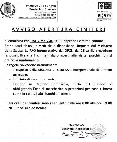 Si informa che, a partire da sabato 9 maggio 2020, riprenderà l'attività del mercato settimanale del sabato, in Piazza Vittorio Emanuele III, esclusivamente per la vendita di generi alimentari.
